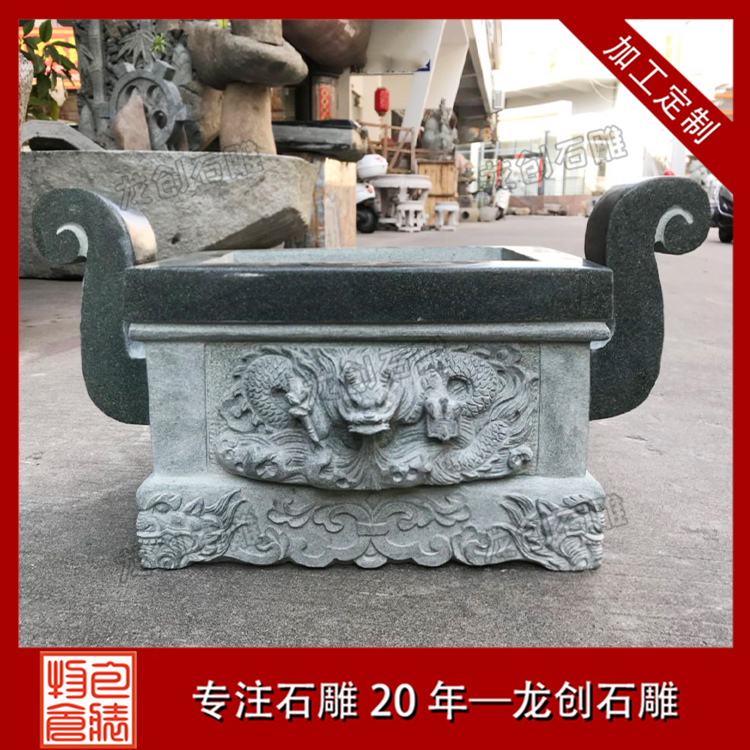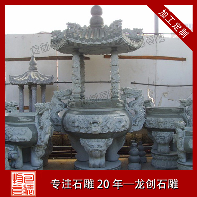 寺廟石雕香爐,佛教中稱它寶鼎,除了方形的香爐外,還有圓形。圓形香爐都有三足,一足在前,兩足在后,是如法的放置;常以之譬喻佛教中的三寶,缺一不可。中華民族香文化發展得很早,古時候的人就常以焚香木熏居室以除臭穢,所以古人讀書彈琴,喜歡先焚一爐香,可以凈雜念而使精神集中。重視欽水思源,慎終追遠是中國人的美德,所以自古以來,華人都拜天地神祗,祭祖先;上香表示敬意,是祭拜儀式中的一個主要項目,香爐就派上用場了。