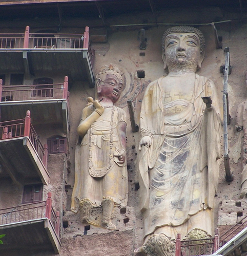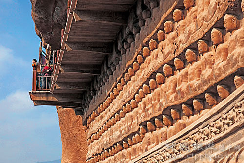 這里的泥塑大致可以分為突出墻面的高浮塑,完全離開墻面的圓塑,粘貼在墻面上的模制影塑和壁塑四類。其中數(shù)以千計(jì)的與真人大小相仿的圓塑,極富生活情趣,被視為珍品。石窟建自公元384年,后來經(jīng)過十多個(gè)朝代的不斷開鑿、重修,遂成為中國(guó)著名的大型石窟之一。