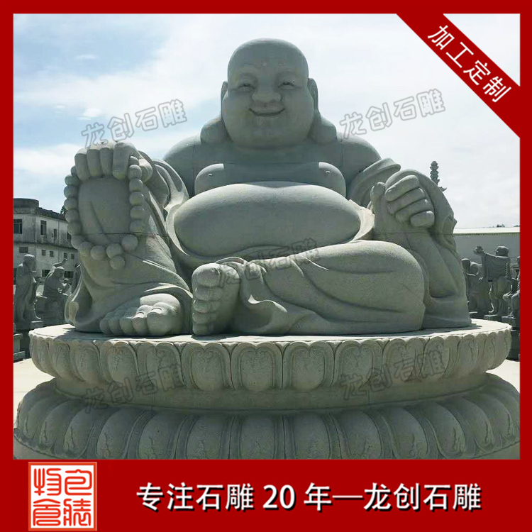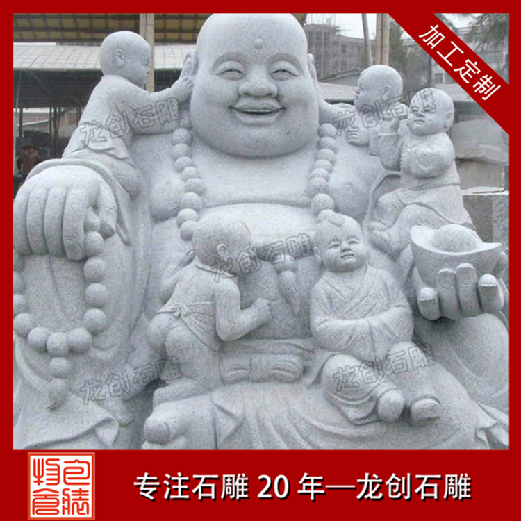 石雕彌勒佛手中還有一乾坤袋,可容天下萬(wàn)物,無(wú)所不有。佛爺以慈善為本,普度眾生,常以袋中之物施舍眾生,救苦救難,尤其是金銀財(cái)寶。所以世人若求消災(zāi)解難,富貴平安,那一定要在家中供奉彌勒佛。當(dāng)然無(wú)論你是否得到你想要的東西,都應(yīng)該笑對(duì)人生,做一個(gè)像佛爺一樣的樂(lè)天派。所謂一笑解千愁。人們見(jiàn)此佛像,往往受他那坦蕩的笑容感染而忘卻自身的煩惱。很多寺院的彌勒殿還有這樣一幅對(duì)聯(lián):大肚能容,容天下難容之事;開(kāi)口便笑,笑世間可笑之人。