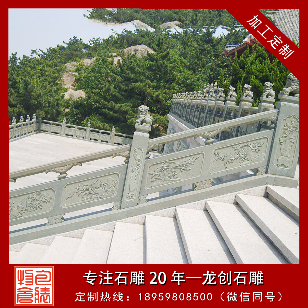 石雕欄桿不僅有安全維護(hù)作用,具有很好的裝飾效果。望柱柱頭常做成回雌形式,題材多為寓意吉祥的勸物、花頭等立體型;菊柱多飾成荷葉凈瓶形式,尋杖以線腳裝飾;欄板是重點(diǎn)裝飾的部分,常施以扮致的雌飾,題材廣泛,并與拄頭的內(nèi)容相呼應(yīng)。由立柱、墊塊、柱頭、抱鼓、欄板組成的石欄桿有時(shí)尚、環(huán)保、美觀、不變形、抗老化的優(yōu)點(diǎn),所以被廣泛應(yīng)用于交通橋梁、水利、公園等護(hù)欄工程。它的種類多種多樣,各種石材都可制作,常見(jiàn)的還是漢白玉欄桿、花崗石欄桿和青石欄桿。