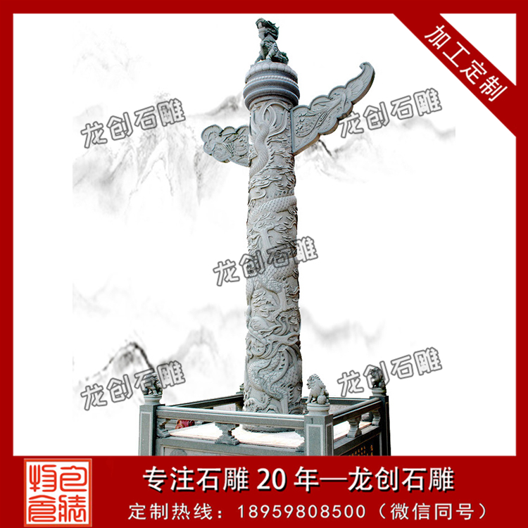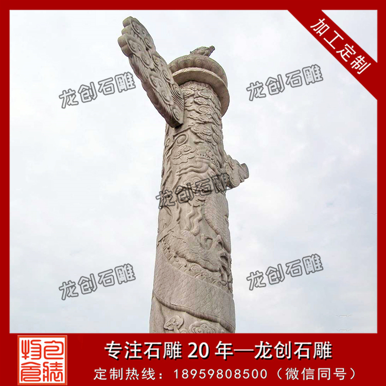 石雕中華柱(石雕華表)是古代宮殿、陵墓等大型建筑物前面做裝飾用的巨大石柱,是中國一種傳統(tǒng)的建筑形式。相傳華表既有道路標(biāo)志的作用,又有為過路行人留言的作用,在原始社會的堯舜時代就出現(xiàn)了,具有歷史悠久的特點(diǎn)。