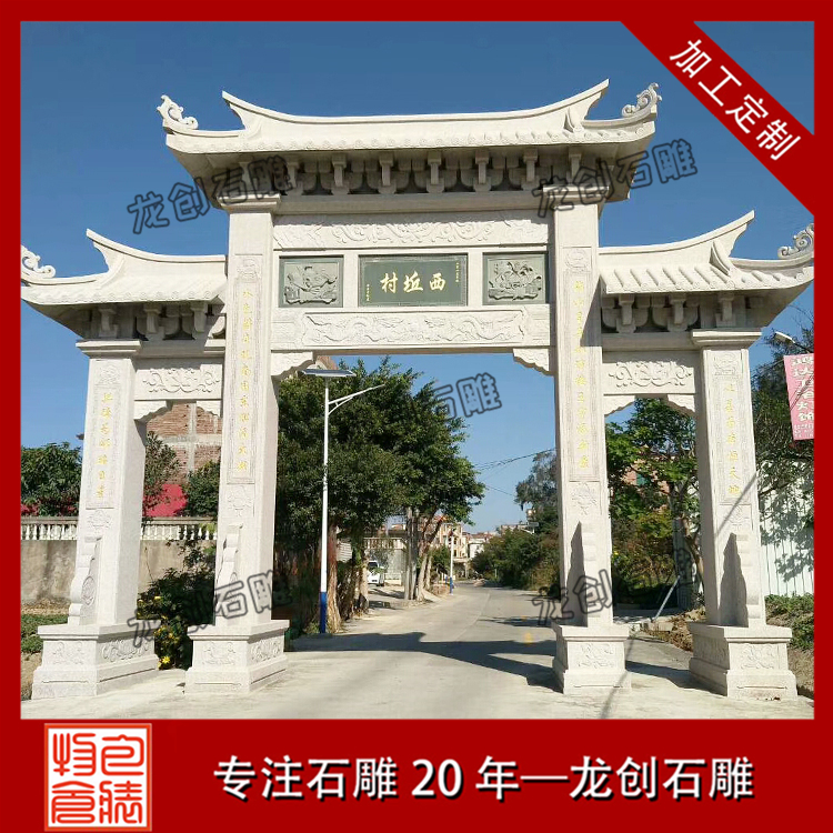 石牌樓是我國建筑中的藝術代表,集中展示了我國雕刻文化,也能夠探索到不同歷史時期的故事。石牌樓如今建造應用多,尤其在新農村村口石牌樓設計制作及選購中,因為修建石牌樓是為了彰顯新農村面貌,不少新農村建設也都會作為重點設計考慮。那么新農村村口石牌樓設計制作及選購有哪些注意事項? 下面由村口石牌樓廠家龍創石雕為大家介紹。